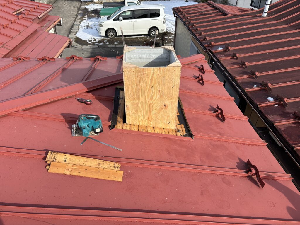 屋根上の準備ができたら煙突枠の下地を取り付けます。