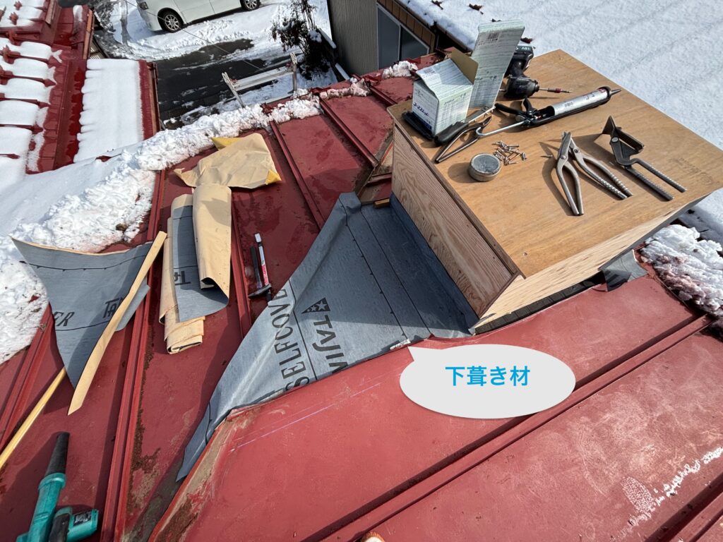 屋根材を撤去後下地をつける前に屋根の下葺き材を敷いておきます。