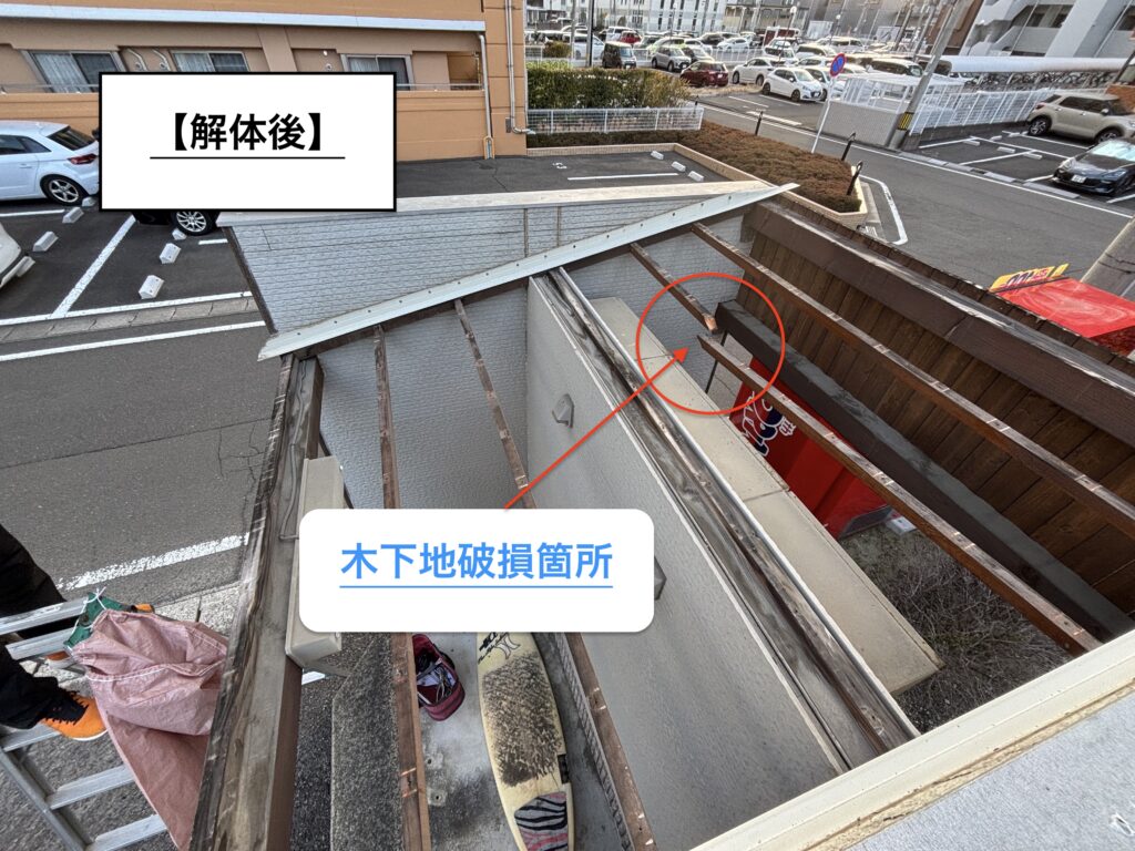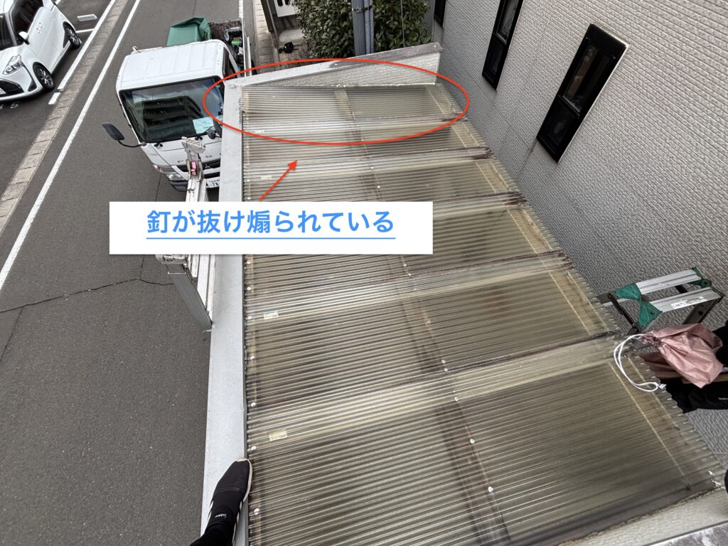 現地に伺って確認してみると、ポリカーボネート製の屋根が経年劣化によってかなり脆くなっており、釘が抜けている状態でした。