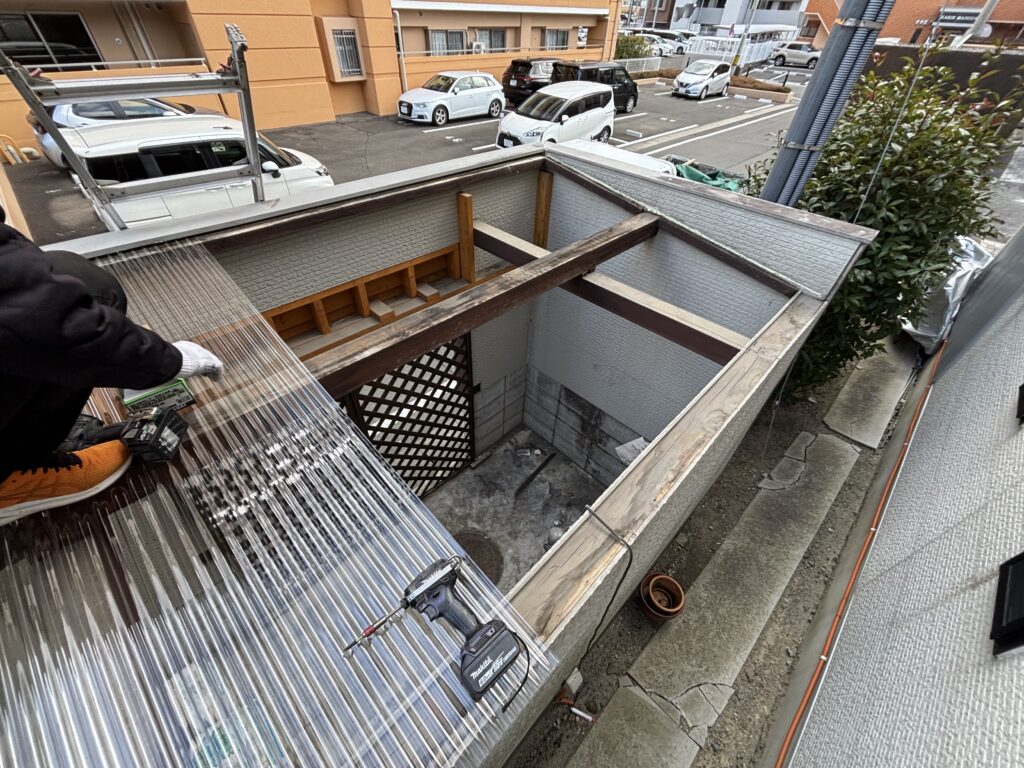 お客様と相談のうえ、今回は新しいポリカーボネート板に全面的に葺き替えることにしました。