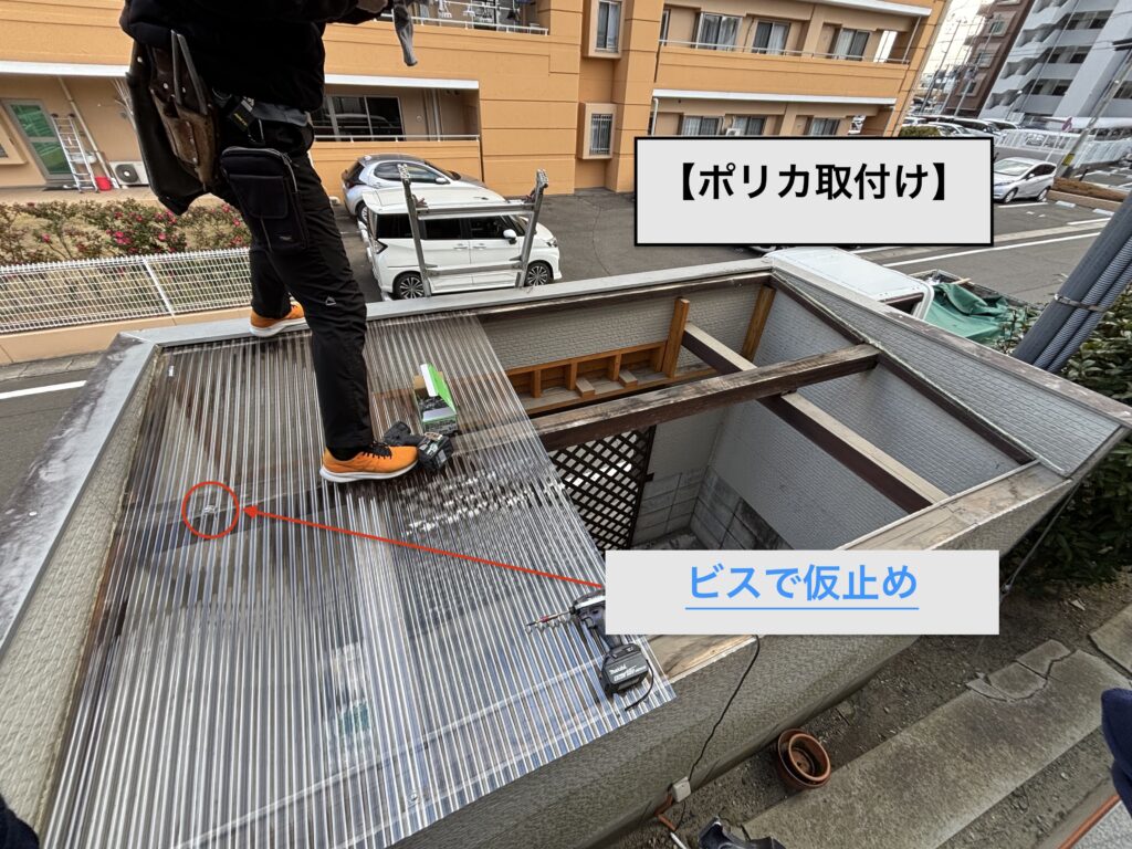 既存のポリカ屋根は釘固定でしたが、今回はビスで固定して保持力を高めます。