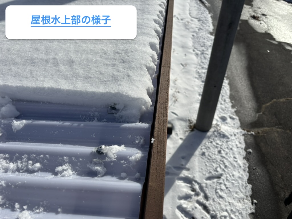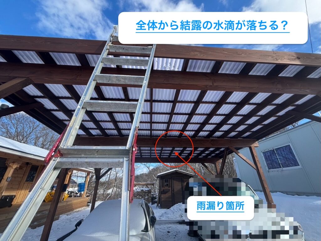 屋根が切りっぱなしの状態で納められており、ここから溶けた雪がポリカ板の裏を伝わって雨水が落ちたものと考えられます。