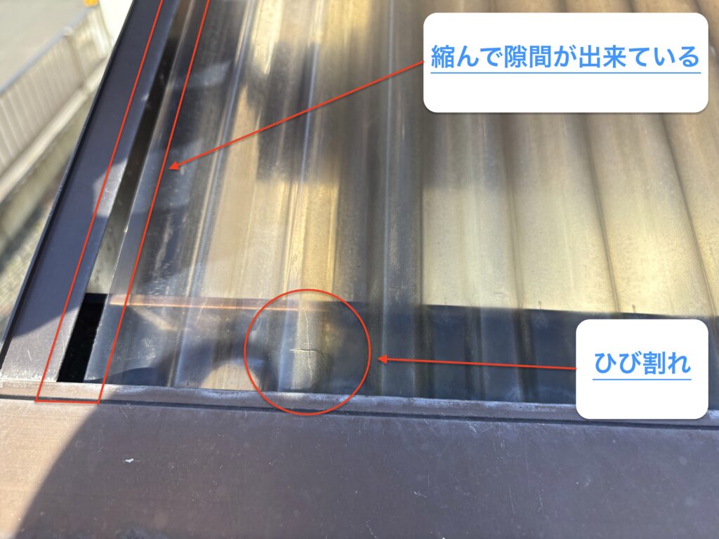 もう少しよく見てみると、ポリカ板のひび割れ、経年劣化による本体の縮みを発見しましました。