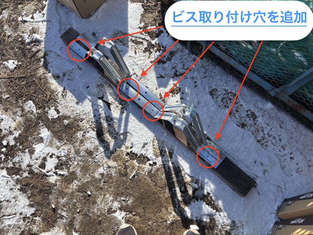 タイトフレームにビスを止める穴をあけていきます。