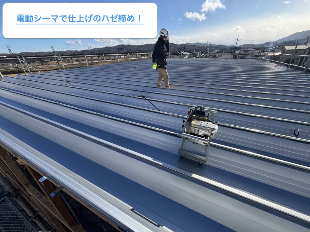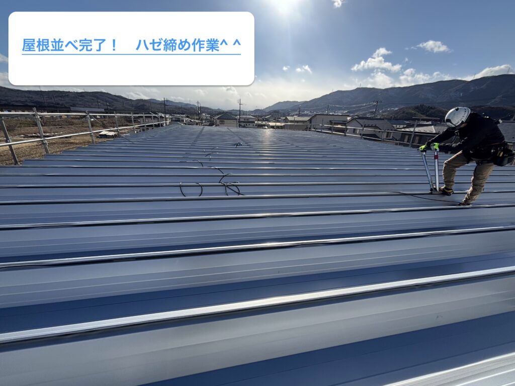 青空の下、広い屋根に長い屋根材を一枚一枚丁寧に並べていく現場。