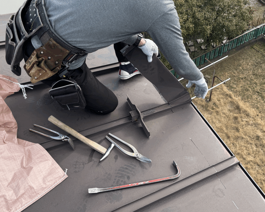 屋根材同士を専用の道具でしっかり固定していきます。