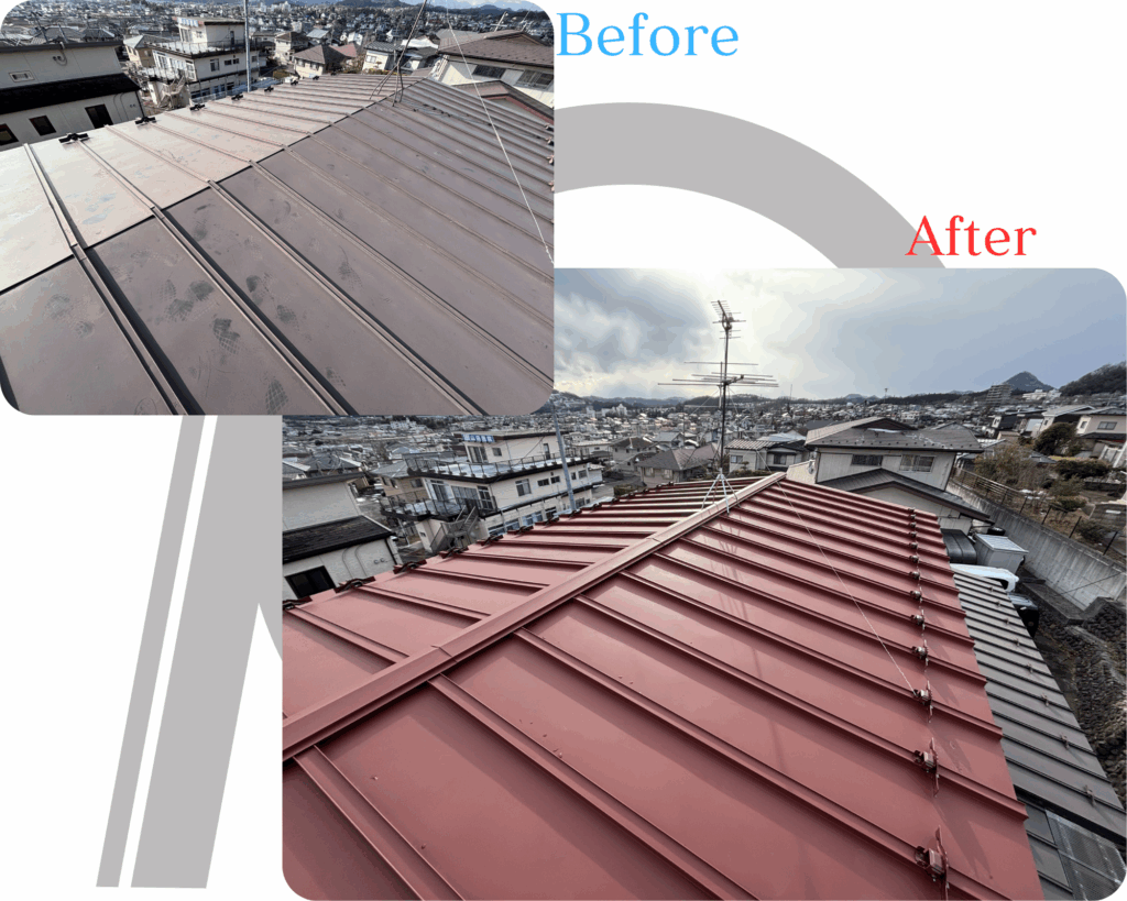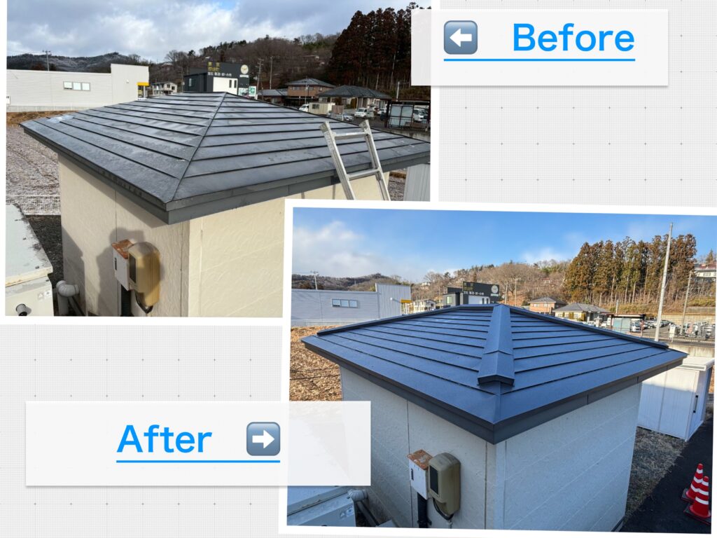 【ビフォーアフター】■ 宮城県郷六で屋根葺き替え工事を行いましたこんにちわ^^K.メタルクラフトです!今回は宮城県郷六エリアにて、屋根葺き替え工事を行いました。屋根の一部に損傷が確認されたため、今後の